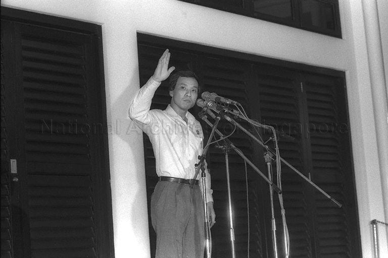 LOW THIA KHIANG OF THE WORKERS' PARTY (WP) SPEAKS AFTER HIS VICTORY DURING THE 1991 GENERAL ELECTION COUNTING CENTRE AT RAFFLES INSTITUTION FOR BRADDELL HEIGHTS, HOUGANG AND POTONG PASIR