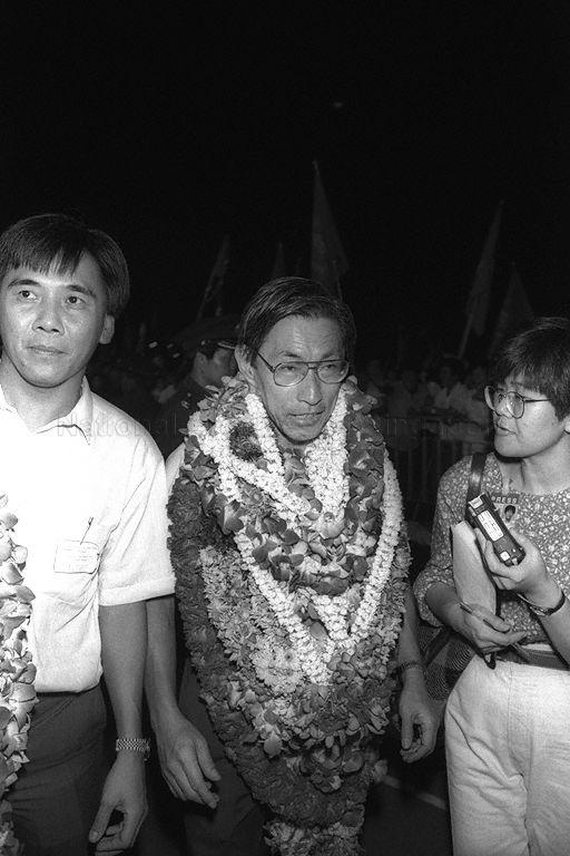CHIAM SEE TONG OF SINGAPORE DEMOCRATIC PARTY (SDP) AFTER HIS VICTORY DURING THE 1991 GENERAL ELECTION COUNTING CENTRE AT RAFFLES INSTITUTION FOR BRADDELL HEIGHTS, HOUGANG AND POTONG PASIR