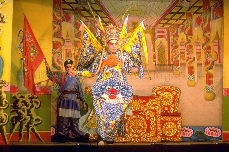 CHINESE OPERA - A "WU XIAO SHENG" IN FULL REGALIA, INCLUDES TRIANGULAR PENNANTS THAT SHOWS HE HAS RECEIVED AUTHORITY FROM THE EMPEROR