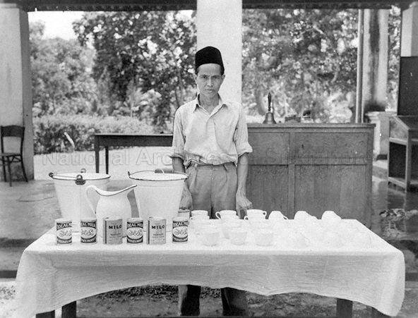 A MAN WITH FREE SKIMMED MILK TO BE GIVEN TO STUDENTS DURING RECESS IN THE KAMPONG DAYS