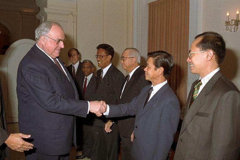 CHANCELLOR OF THE FEDERAL REPUBLIC OF GERMANY, DR HELMUT KOHL MEETING FOREIGN AFFAIRS MINISTER WONG KAN SENG AT A DINNER HOSTED BY PRIME MINISTER GOH CHOK TONG AT THE ISTANA