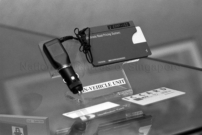An in-vehicle unit (IVU) on display during signing ceremony to mark official launch of three electronic road pricing (ERP) demonstration projects held at Port of Singapore Authority (PSA) auditorium. Guest of honour at the event was Minister for Communications Mah Bow Tan.