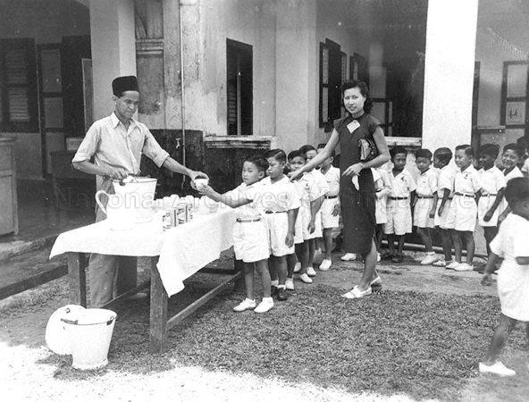 A MAN GIVING OUT FREE SKIMMED MILK TO STUDENTS DURING RECESS IN THE KAMPONG DAYS