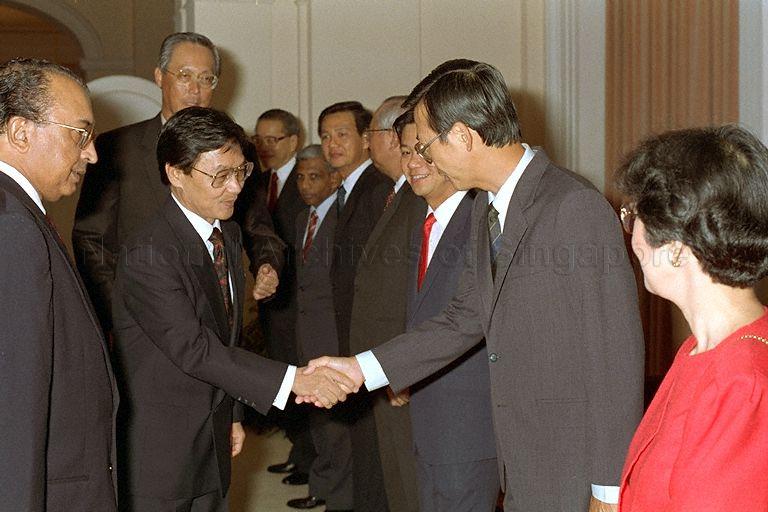 PRIME MINISTER OF THAILAND CHUAN LEEKPAI IS INTRODUCED TO THE MINISTER FOR LABOUR AND SECOND MINISTER FOR DEFENCE DR LEE BOON YANG AT THE DINNER HOSTED BY PRIME MINISTER GOH CHOK TONG AT THE ISTANA