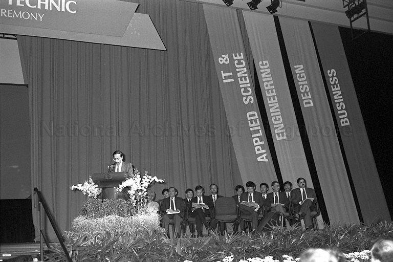 TEMASEK POLYTECHNIC'S PRINCIPAL N VARAPRASAD GIVING A SPEECH AT THIRD GRADUATION CEREMONY OF THE POLYTECHNIC HELD AT HARBOUR PAVILION, WORLD TRADE CENTRE. AMONG THOSE SEATED ON STAGE IS MINISTER FOR EDUCATION LEE YOCK SUAN (FRONT ROW, FOURTH FROM RIGHT).