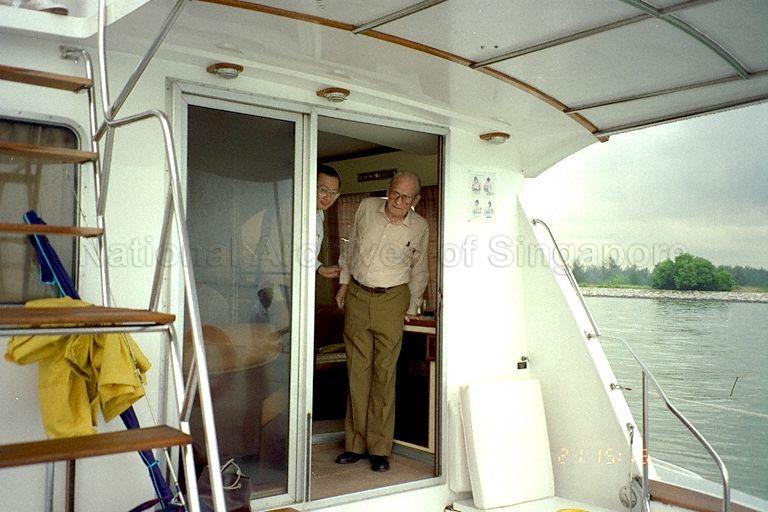 DUTCH ECONOMIST AND SINGAPORE'S CHIEF ECONOMIC ADVISOR FROM 1961 TO 1983 DR ALBERT WINSEMIUS (RIGHT) ON BOARD A VESSEL ON SINGAPORE RIVER DURING HIS VISIT TO SINGAPORE. HE WAS ACCOMPANIED BY NTUC INCOME CO-OPERATIVE LIMITED'S CHAIRMAN NG POCK TOO (LEFT), MINISTRY OF NATIONAL DEVELOPMENT AQUACULTURE BRANCH HEAD MR LESLIE CHEONG, OFFICER FROM ECONOMIC DEVELOPMENT BOARD'S STRATEGIC AND CORPORATE PLANNIING UNIT SOH SZU WEI AND TAN SER MIN