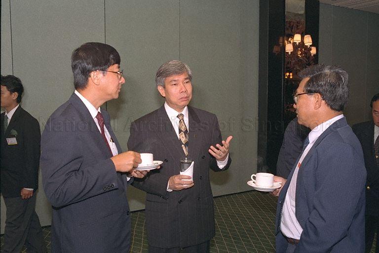 Minister without Portfolio Lim Boon Heng (left) and Malaysia's Minister of Human Resources, Datuk Lim Ah Lek (centre) talking with a delegate during the tenth Association of Southeast Asian Nations (ASEAN) Labour Ministers' Meeting held at Hyatt Regency Hotel