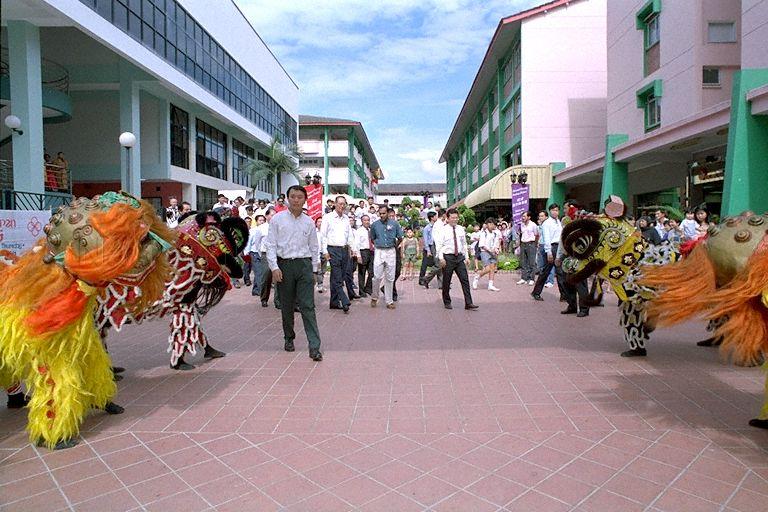 PRIME MINISTER GOH CHOK TONG AS GUEST-OF-HONOUR IS GREETED BY LION DANCE AT THE UPGRADING PROGRAMME EXHIBITON TOWARDS MODERNISATION OF THE HOUSING DEVELOPMENT BOARD RETAILERS ORGANISED BY THE FEDERATION OF MERCHANTS ASSOCIATION AT CHONG PANG CITY