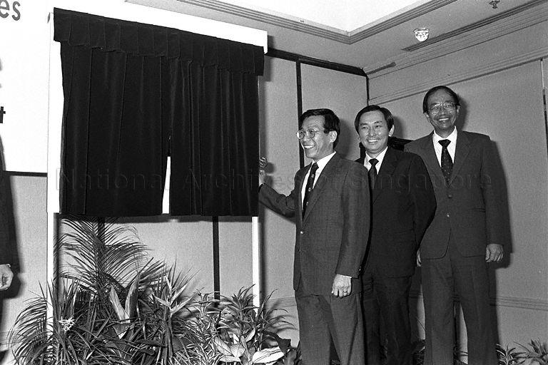 MINISTER FOR COMMUNICATIONS AND THE ENVIRONMENT MAH BOW TAN UNVEILING COMMEMORATIVE PLAQUE DURING LAUNCH OF SINGAPORE ASSOCIATION FOR ENVIRONMENTAL COMPANIES (SAFECO) AT CROWN PRINCE HOTEL