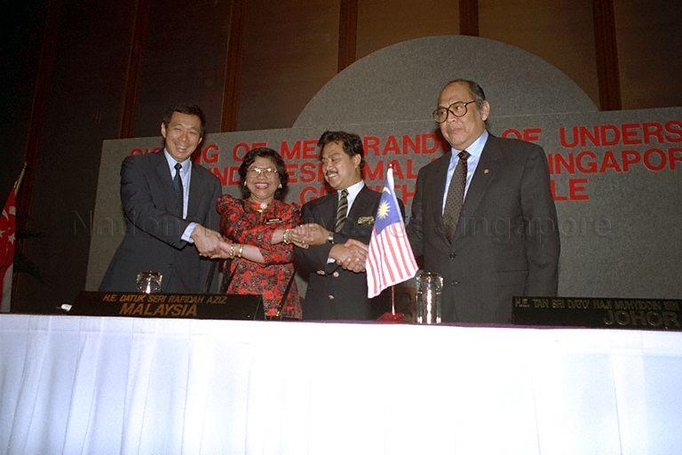 (FROM LEFT) DEPUTY PRIME MINISTER BRIGADIER-GENERAL LEE HSIEN LOONG, MALAYSIAN INTERNATIONAL TRADE AND INDUSTRY MINISTER DATUK SERI RAFIDAH AZIZ, MENTERI BESAR OF JOHOR TAN SRI MUHYIDDIN YASSIN AND INDONESIA'S COORDINATING MINISTER FOR TRADE AND INDUSTRY HARTARTO AT SIGNING OF MEMORANDUM OF UNDERSTANDING FOR INDONESIA-MALAYSIA-SINGAPORE GROWTH TRIANGLE (IMS-GT) HELD AT HYATT REGENCY, JOHOR BARU