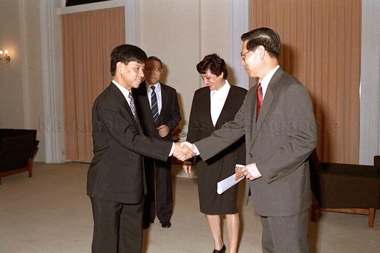 PRESIDENT ONG TENG CHEONG GREETS MR CHOO HAN TECK WHO IS TO BE SWORN IN AS JUDICIAL COMMISSIONER OF SUPREME COURT AT ISTANA STATE ROOM