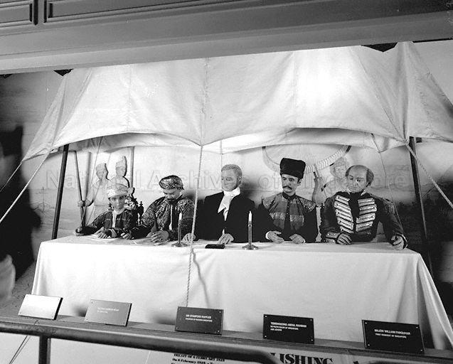 Wax figures at Images of Singapore, Sentosa, depicting signing of the treaty on 6 February 1819 between Lieutenant-General of Bencoolen Sir Stamford Raffles (middle), Sultan Hussein Shah of Johor (second from left) and local chieftain, Temenggong Abdul Rahman (second from right), allowing the British to establish a trading settlement in Singapore. Major William Farquhar (right) was soon appointed Resident and Commandant of Singapore by Sir Stamford Raffles.