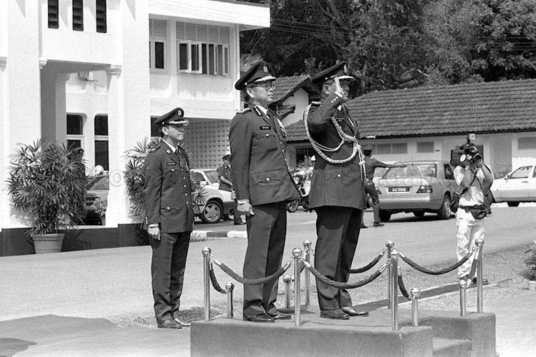 THE MALAYSIAN INSPECTOR-GENERAL OF POLICE TAN SRI ABDUL RAHIM BIN MOHD NOOR TAKING THE SALUTE OF THE MARCHPAST AT THE SENIOR POLICE OFFICERS' MESS