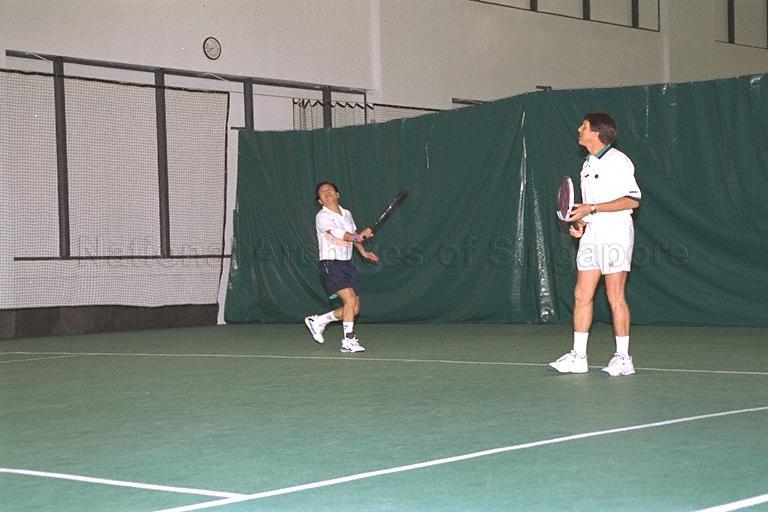 PRIME MINISTER GOH CHOK TONG PLAYING TENNIS WITH THE CHAIRMAN OF THE NATIONAL COMMITTEE OF THE CHINESE PEOPLE'S POLITICAL CONSULTITIVE CONFERENCE (CPPCC) LI RUI HUAN AT THE FOUR SEASONS HOTEL
