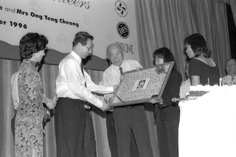 PRESIDENT ONG TENG CHEONG AND MRS ONG RECEIVING A TOKEN OF APPRECIATION DURING THE NATIONAL COUNCIL OF SOCIAL SERVICE VOLUNTEER AWARDS EVENT AND DINNER AT THE RITZ CARLTON HOTEL