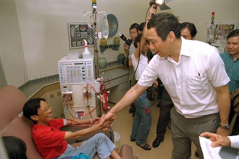 DEPUTY PRIME MINISTER BRIGADIER-GENERAL LEE HSIEN LOONG GREETS PATIENT AT TOA PAYOH SEU TECK SEAN TONG - NATIONAL KIDNEY FOUNDATION (NKF) DIALYSIS CENTRE DURING COMMUNITY VISIT TO NEE SOON EAST DIVISION OF SEMBAWANG GROUP REPRESENTATION CONSTITUENCY (GRC)