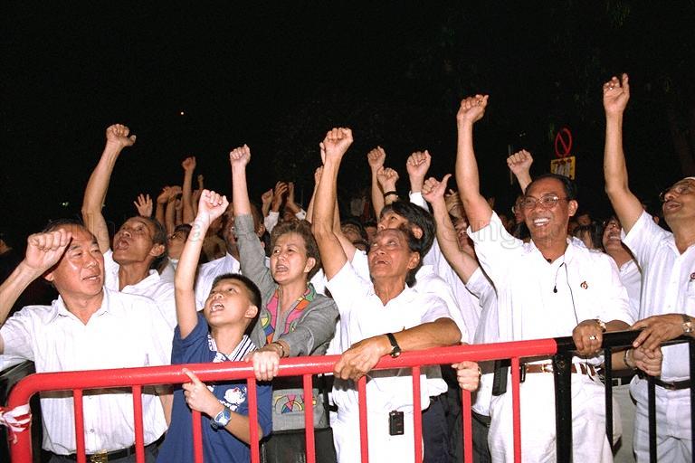POLLING DAY: SINGAPORE CONFERENCE HALL (ALJUNIED AND MACPHERSON) - PICTURE SHOWS PEOPLE'S ACTION PARTY (PAP) SUPPORTERS AT THE COUNTING CENTRE
