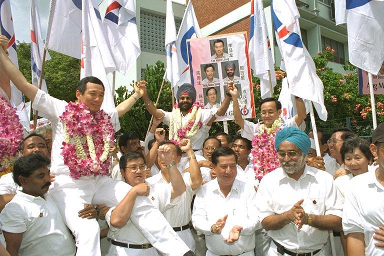 NOMINATION DAY: ANG MO KIO/POTONG PASIR AT ANG MO KIO SECONDARY SCHOOL - PICTURE SHOWS PEOPLE'S ACTION PARTY (PAP) CANDIDATES FOR ANG MO KIO GROUP REPRESENTATION CONSTITUENCY (GRC) BRIGADIER-GENERAL (NS) LEE HSIEN LOONG, INDERJIT SINGH AND SENG HAN THONG BEING CARRIED BY SUPPORTERS