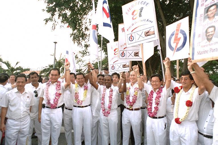NOMINATION DAY: EAST COAST/MARINE PARADE AT TEMASEK JUNIOR COLLEGE - PICTURE SHOWS PEOPLE'S ACTION PARTY (PAP) CANDIDATES FOR EAST COAST GROUP REPRESENTATION CONSTITUENCY (GRC) CHAN SOO SEN, ABDULLAH TARMUGI, PROFESSOR S JAYAKUMAR, TAN SOO KHOON, CHEW HENG CHING AND CHNG HEE KOK
