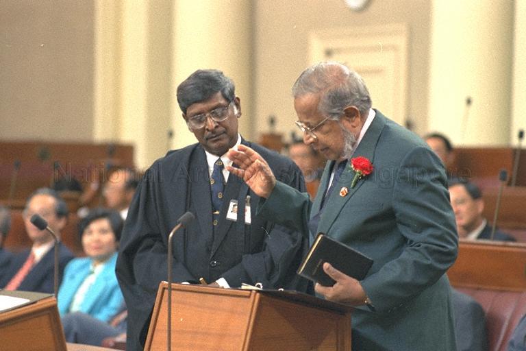 WORKERS' PARTY (WP) NON-CONSTITUENCY MEMBER OF PARLIAMENT (NCMP) J B JEYARETNAM TAKING OATH AS NCMP AT SWEARING-IN CEREMONY DURING FIRST SESSION OF NINTH PARLIAMENT AT PARLIAMENT HOUSE