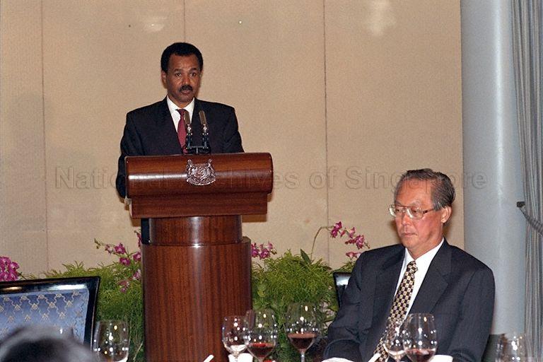 PRESIDENT OF THE STATE OF ERITREA ISAIAS AFEWERKI DELIVERS A SPEECH DURING THE DINNER HOSTED BY PRIME MINISTER GOH CHOK TONG AT THE COMPASSROSE, WESTIN STAMFORD HOTEL