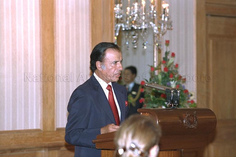 PRESIDENT OF ARGENTINA CARLOS MENEM DELIVERS A SPEECH AT DINNER HOSTED BY PRIME MINISTER GOH CHOK TONG AT RAFFLES HOTEL BALLROOM