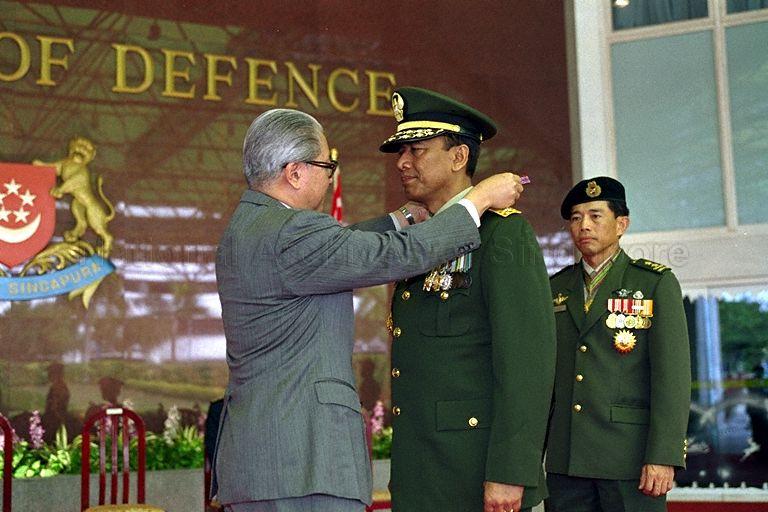MINISTER FOR DEFENCE, DR TONY TAN KENG YAM PRESENTING THE MERITORIOUS SERVICE MEDAL (MILITARY) TO INDONESIAN ARMY CHIEF OF STAFF GENERAL WIRANTO AT MINISTRY OF DEFENCE (MINDEF), GOMBAK DRIVE