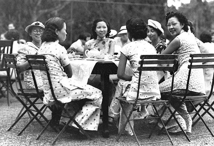 MEMBERS OF YOUNG WOMEN'S CHRISTIAN ASSOCIATION (YWCA) HAVING TEA AT SINGAPORE BOTANIC GARDENS