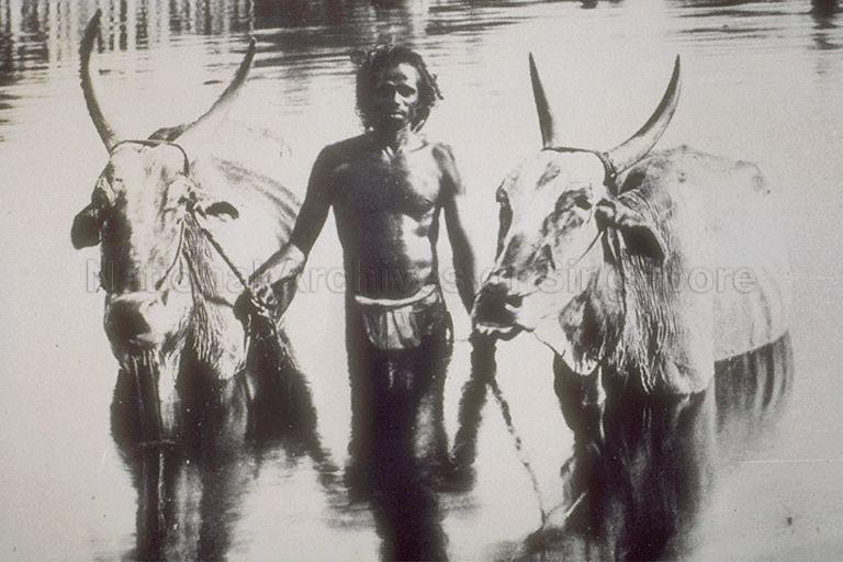 ROCHOR CANAL - INDIAN MAN WITH HIS BUFFALOES IN RIVER. (C1900)