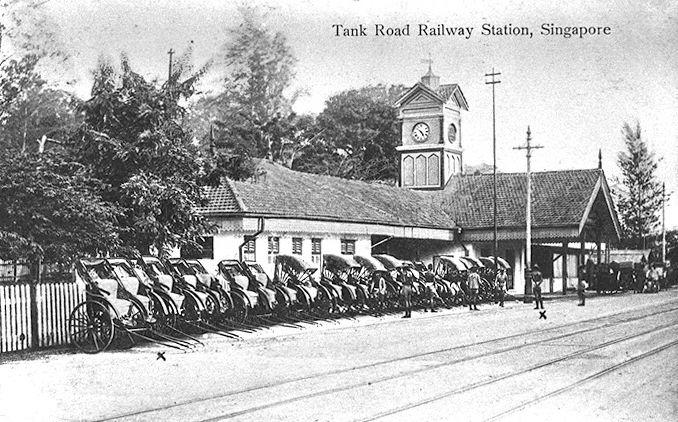 Tank Road railway station with jinrickshaws parked outside waiting for passengers. The station served as the main terminus for passenger trains coming down from the Woodlands jetty on the Singapore-Kranji Railway. Opened in 1903, the station was closed in 1932 when the Tanjong Pagar station opened.