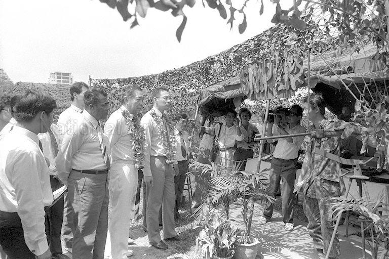 (From right, garlanded) Minister of State for Defence and Trade and Industry Brigadier-General Lee Hsien Loong and Speaker of Parliament and Member of Parliament for Joo Chiat Dr Yeoh Ghim Seng touring the Total Defence exhibition at Bedok North Secondary School after the six-day residential seminar was officially opened earlier