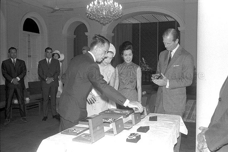 President Benjamin Sheares presenting gifts to Queen Elizabeth II, Duke of Edinburgh Prince Philip and Princess Anne, at the Istana State Room. Gifts on display include the Order of Temasek for both the Queen and Duke, the Distinguished Service Order and jade pendant for Princess Anne, three gold-plated Rollei cameras, and three gold signet rings. Mrs Sheares (second from right), Minister for Social Affairs Othman bin Wok (background, left) and British High Commissioner to Singapore Sir Sam Falle are also present.