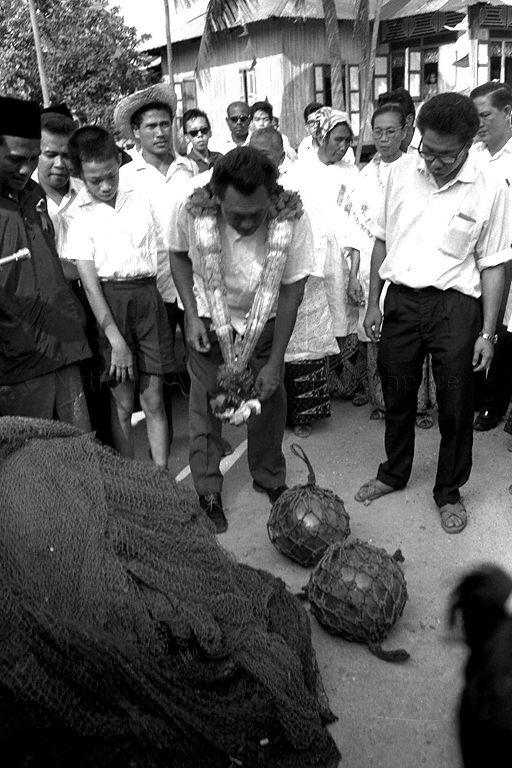PRIME MINISTER LEE KUAN YEW WITH HIS SON, LEE HSIEN LOONG VISITING A FISHING VILLAGE AT PULAU SUDONG DURING THEIR TOUR OF THE SOUTHERN ISLANDS
