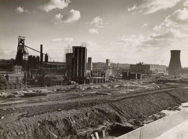 INDUSTRY: NEW IRON AND STEEL PLANT. A GENERAL VIEW OF THE NEW IRON AND STEEL PLANT AT RAVENSCRAIG, NEAR MOTHERWELL, SCOTLAND, SHOWING THE BLAST FURNACE, COKE OVENS BUNKER, BENZOLE SCRUBBERS FOR RECOVERING BENZOLE FROM COKE OVEN GAS, THE POWER STATION AND COOLING TOWER. THE NEW PLANT, WHEN COMPLETE, WILL INCREASE SCOTLAND'S ANNUAL OUTPUT OF PIG IRON BY 350,000 TONS AND STEEL BY 400,000 TONS.