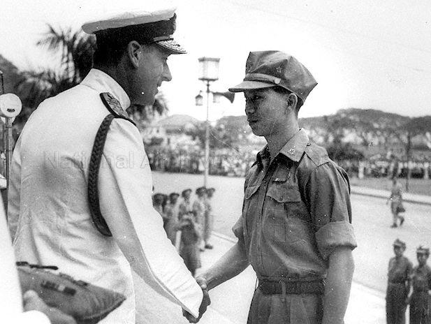 On the left is Lord Louis Mountbatten. On the right is Chin Peng, then member of the Malayan People's Anti-Japanese Army (MPAJA) and would later go on to be the Secretary-General of the Malayan Communist Party (MCP) or Communist Party of Malaya (CPM). The MPAJA leaders were awarded with British campaign medals for their contributions to the Allied war efforts.