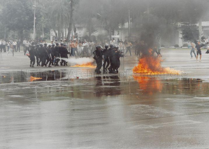 A RIOT CONTROL SIMULATION DRILL WHERE TROOPERS FROM THE SPECIAL OPERATIONS COMMAND FIGHT OFF A VIOLENT CROWD HURLING LIVE FIRE BOMBS AND BRICKS STAGED DURING PRESIDENT ONG TENG CHEONG'S VISIT TO THE SINGAPORE POLICE FORCE AT POLICE ACADEMY.