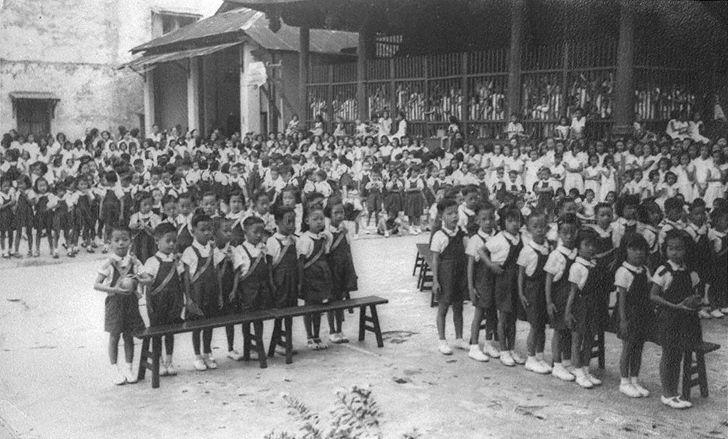 Students of Chong Hock Girls' School at the assembly hall in Thian Hock Keng. The school had the first intake of boys in 1949.