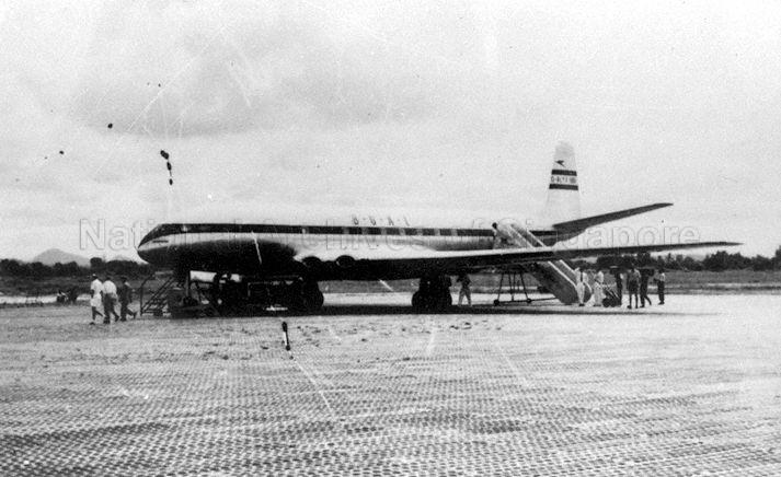 A BOAC DE HAVILLAND COMET JETLINER AT CHANGI RAF AIRFIELD, THE FIRST JUMBO JET SERVICE TO REACH SINGAPORE, BUT UNABLE TO LAND AT KALLANG AIRPORT DUE TO RUNWAY LIMITATION.