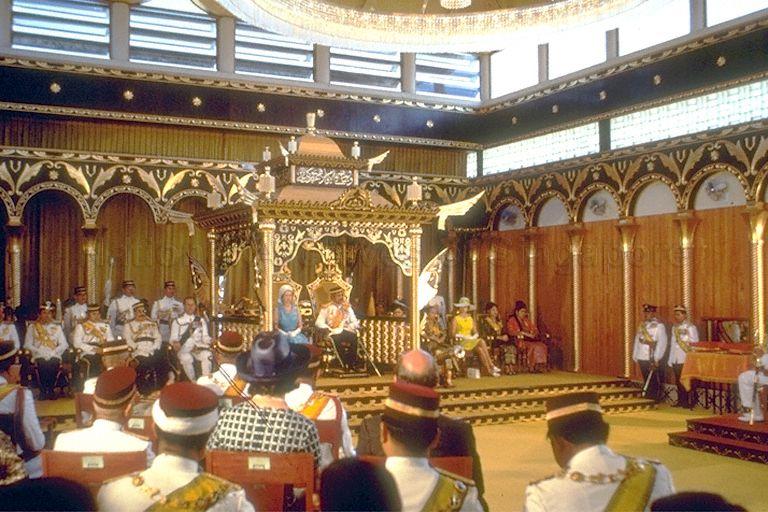 QUEEN ELIZABETH SAT WITH THE SULTAN OF BRUNEI HASSANAL BOLKIAH ON THE ROYAL THRONE INSIDE THE PARLIAMENT HOUSE WHEN SHE VISITED BRUNEI