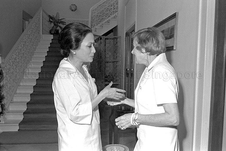 MRS S RAJARATNAM, THE WIFE OF THE MINISTER FOR FOREIGN AFFAIRS OF SINGAPORE GREETS MRS KUKRIT PRAMOJ, THE WIFE OF THE PRIME MINISTER OF THAILAND AT THE TEA PARTY HOSTED BY THE FORMER