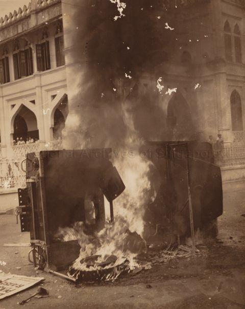 MARIA HERTOGH RIOTS - A POLICE VAN WAS BURNT IN FRONT OF SULTAN MOSQUE AT NORTH BRIDGE ROAD