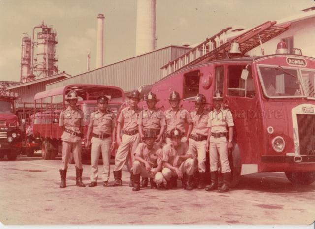 FIREMEN POSING WITH MAJOR PUMP 5 (DENNIS F12 FIRE ENGINE), AFTER A DRILL AT ESSO REFINERY ON PULAU AYER CHAWAN