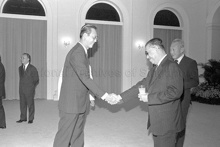 BURMESE PRIME MINISTER U MAUNG MAUNG KHA MEETING FIRST DEPUTY PRIME MINISTER AND DEFENCE MINISTER GOH CHOK TONG DURING A DINNER HOSTED BY PRIME MINISTER LEE KUAN YEW AT THE ISTANA