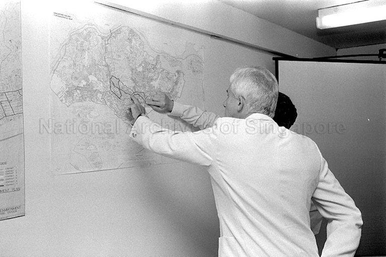 PROJECT DIRECTOR LING TECK LUKE HOLDING BRIEFING ON THE BUKIT TIMAH FLOOD ALLEVIATION SCHEME AT BUKIT TIMAH SITE OFFICE. LUXMBOURG DEPUTY PRIME MINISTER AND TREASURY MINISTER JACQUES POOS IS ALSO PRESENT.