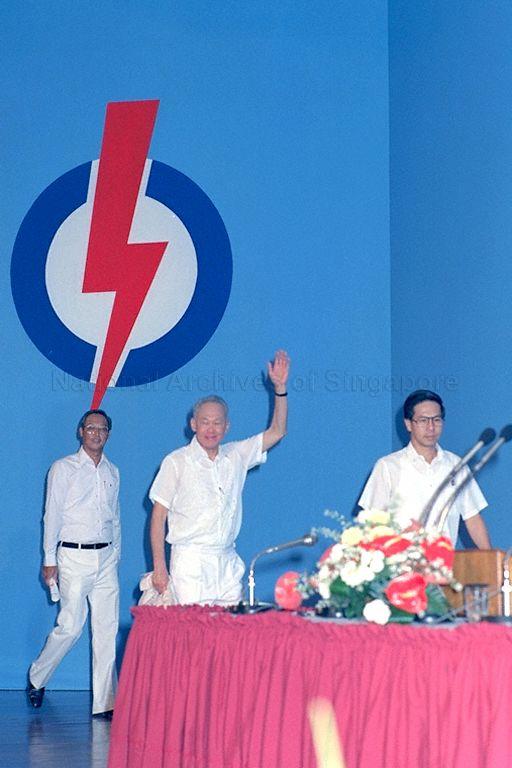 PRIME MINISTER LEE KUAN YEW (CENTRE) WITH FIRST DEPUTY PRIME MINISTER (DPM) AND MINISTER FOR DEFENCE GOH CHOK TONG (LEFT) AND SECOND DPM ONG TENG CHEONG AT PEOPLE'S ACTION PARTY (PAP) CONVENTION '88 (AGENDA FOR ACTION) HELD IN SINGAPORE CONFERENCE HALL