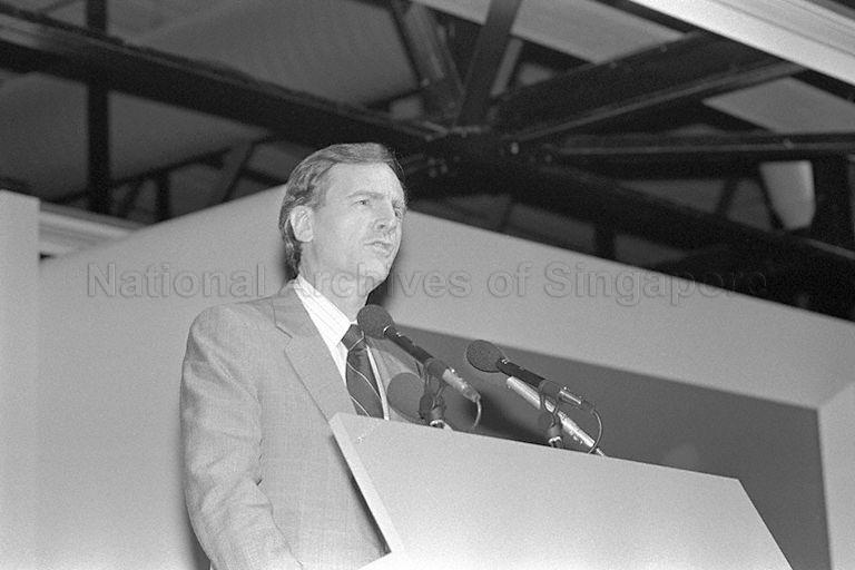 APPLE'S CHAIRMAN AND CHIEF EXECUTIVE OFFICER JOHN SCULLEY DELIVERS A SPEECH AT OFFICIAL OPENING OF NEW FACTORY OF APPLE COMPUTER SINGAPORE PTE LTD IN ANG MO KIO STREET 64