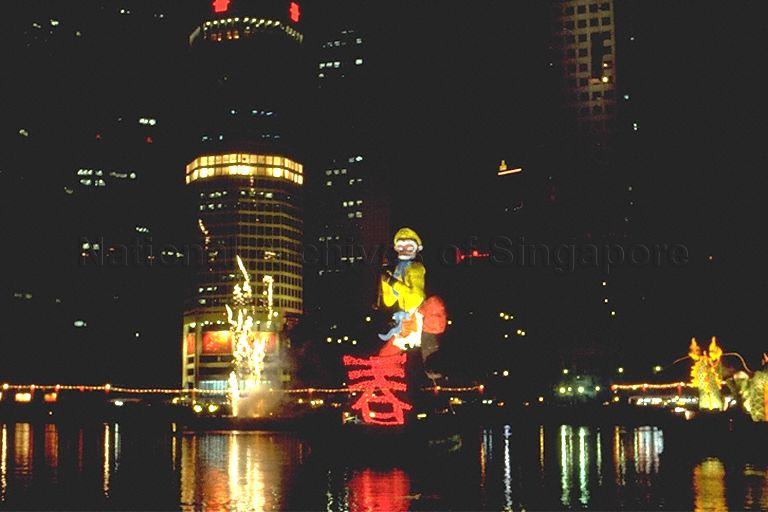 Fireworks and five-story Monkey God float at Singapore River Hongbao 1992 gala show. 1992 was the Year of the Monkey, according to the Chinese zodiac calendar.