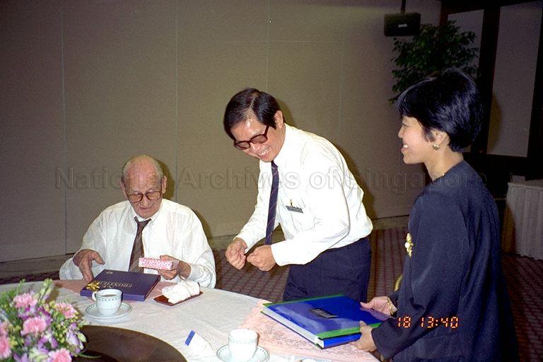 DUTCH ECONOMIST AND SINGAPORE'S CHIEF ECONOMIC ADVISOR FROM 1961 TO 1983 DR ALBERT WINSEMIUS BEING PRESENTED WITH GIFTS FROM CHIEF EXECUTIVE OFFICER OF JURONG TOWN CORPORATION SWEE KEE SIONG