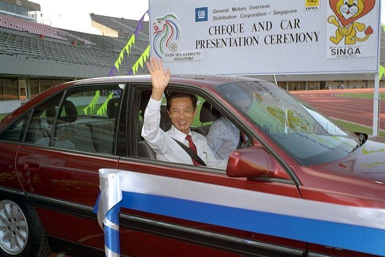 Defence Minister and President of the Singapore National Olympic Council, Dr Yeo Ning Hong waving from the Opel 2.0i donated by General Motors (GM) through its Singapore subsidiary, GM Overseas Distribution Corporation during the cheque and car presentation ceremony at the National Stadium. GM became a sponsor with a donation of $750,000 in cash and kind to the Games committee of the 17th Southeast Asian Games 1993. Beside him is Managing Director of GM Overseas Distribution Corporation, Louis J Sorchevich.
