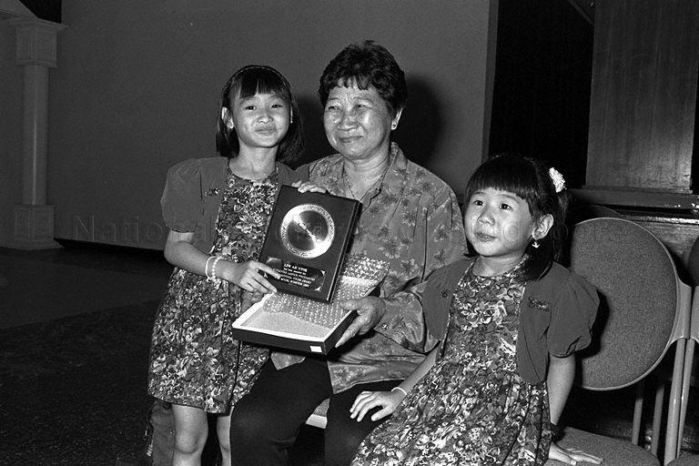 TEA LADY MADAM LEW AH NYOK, ONE OF THE AWARD WINNERS, POSING FOR PHOTOGRAPHS WITH HER GRANDDAUGHTERS DURING PRESENTATION OF SINGAPORE LABOUR FOUNDATION (SLF) AWARDS FOR MODEL WORKERS AT UNION HALL, NATIONAL TRADES UNION CONGRESS (NTUC) CLUB IN SHENTON WAY